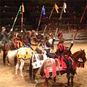 While you are watching the tournament you will enjoy a four course meal which you will eat in true medieval fashion, with your hands. You will be served a full meal, with soup, a full chicken, bread and the kingdoms beast and sweetest dessert. This feast cannot be served with silverware, so be prepared to dig in with your hands, after the show you will be provided with wet wipes to clean up with.